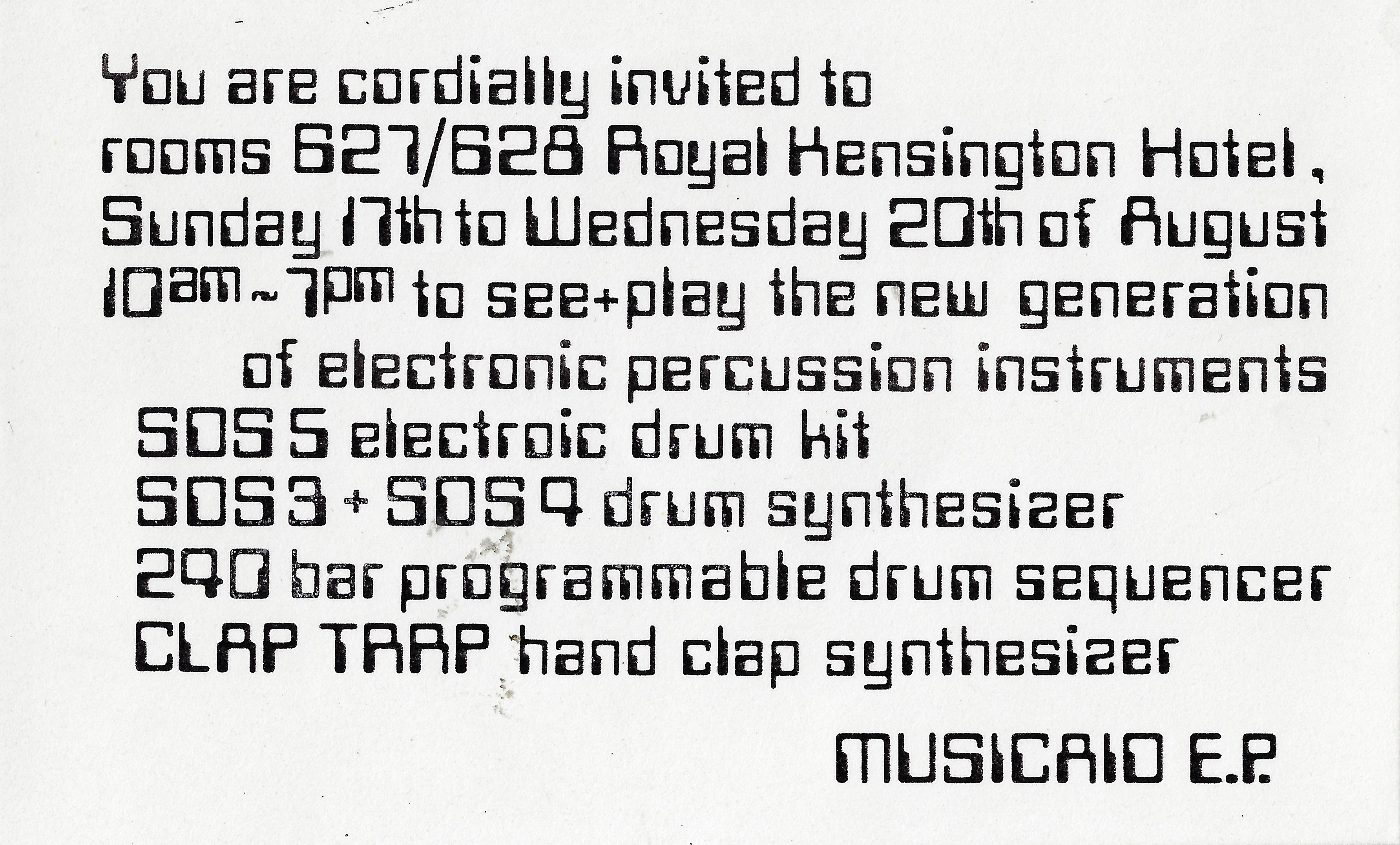 Musicaid invitation to launch SDS V, 1980.