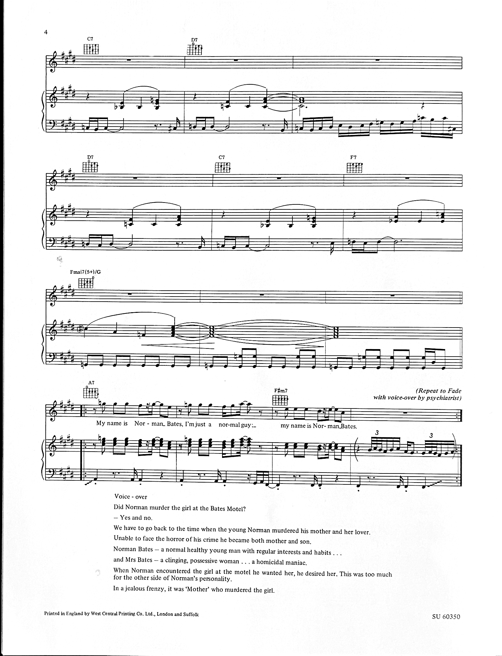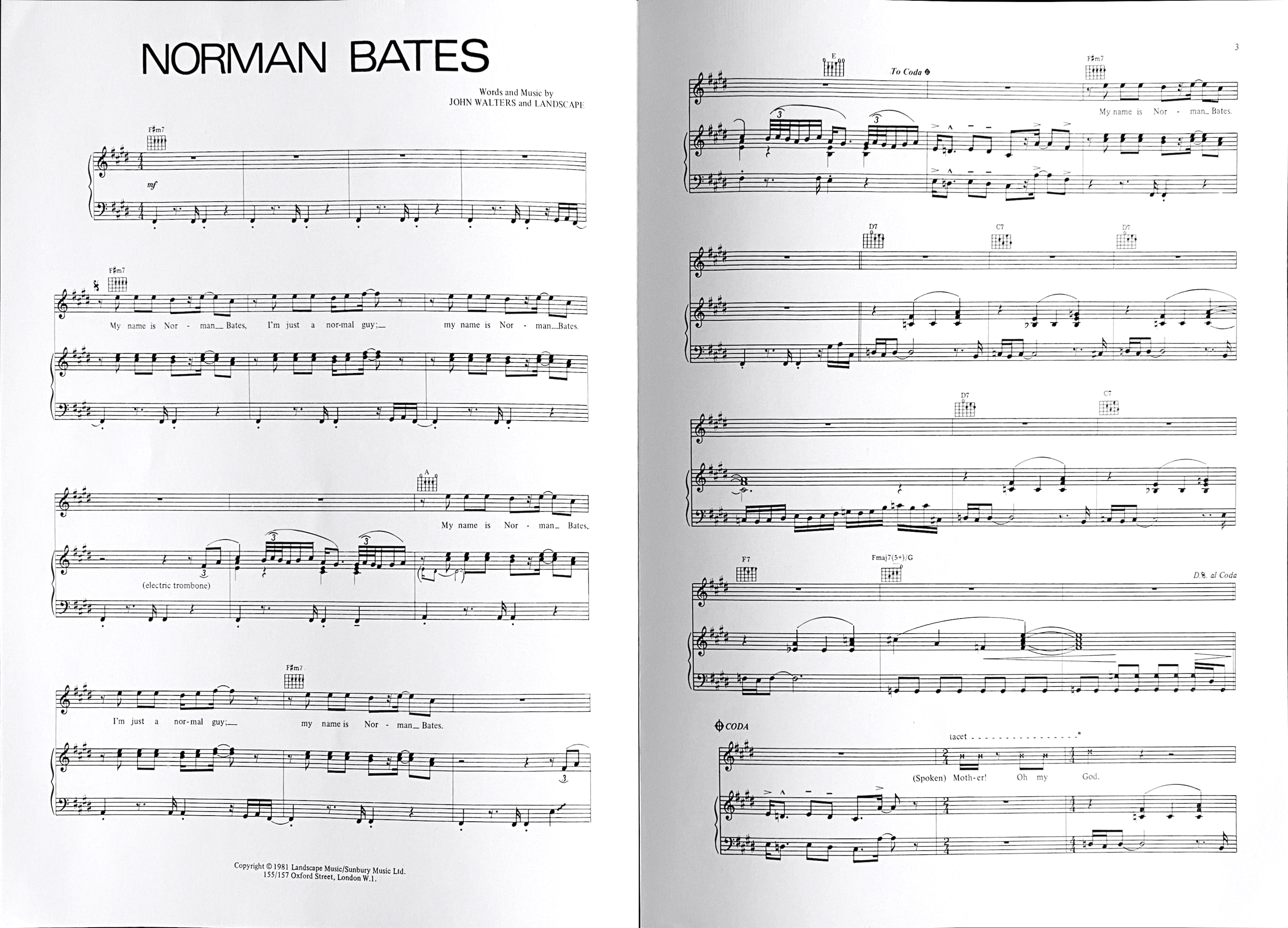 ‘Norman Bates’, though well received by everyone who first encountered it, was an odd choice for the second single from the Tea-Rooms album. Publishing a sheet music piano arrangement was an even odder decision. (In case you try this at home, note that the trombone semiquavers should be ‘swung’ rather than played evenly.)