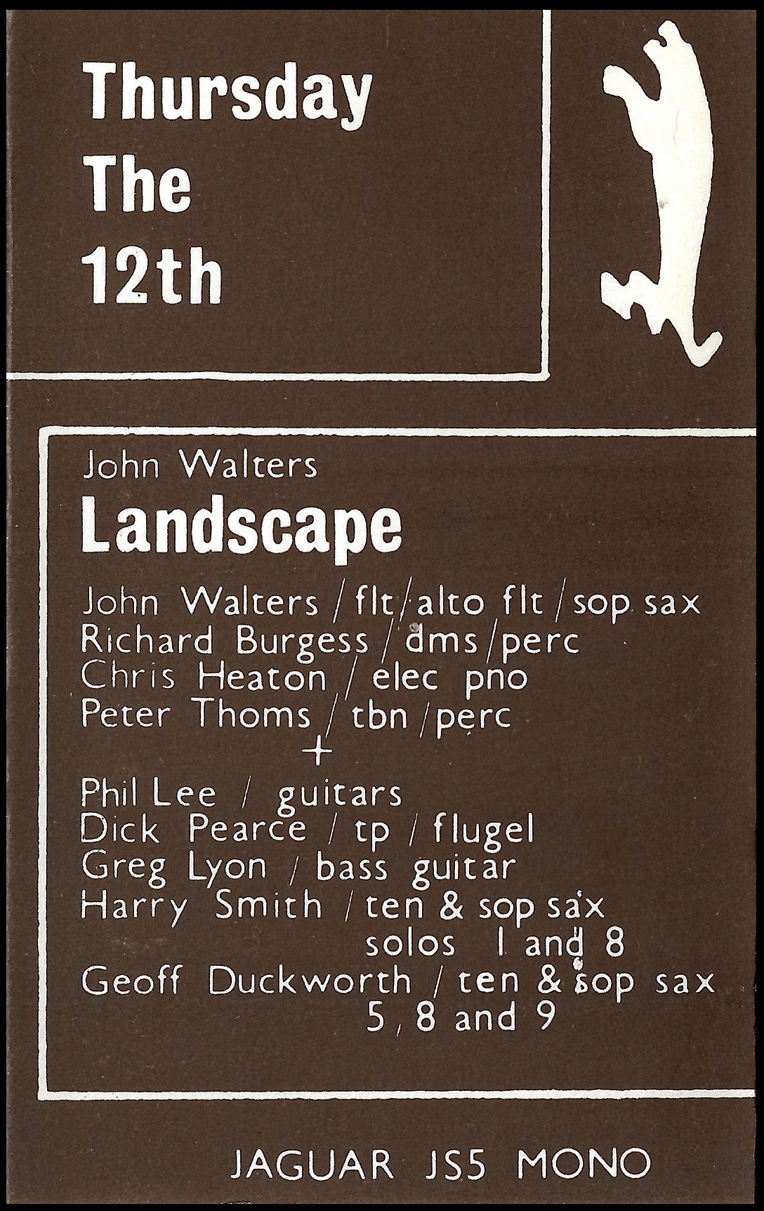 This album was made with the eight-piece version of Landscape that John formed after disbanding the John Walters Nonet in the summer of 1974. Thursday the 12th features music he had written while studying maths with physics at King’s College London. Some of the charts were quite demanding, and appealed to musicians who regarded the music as a challenge. (The one non-Walters number was ‘Sixty-One’ by trombonist Peter Thoms, who had just come back from a gig in Hong Kong.)