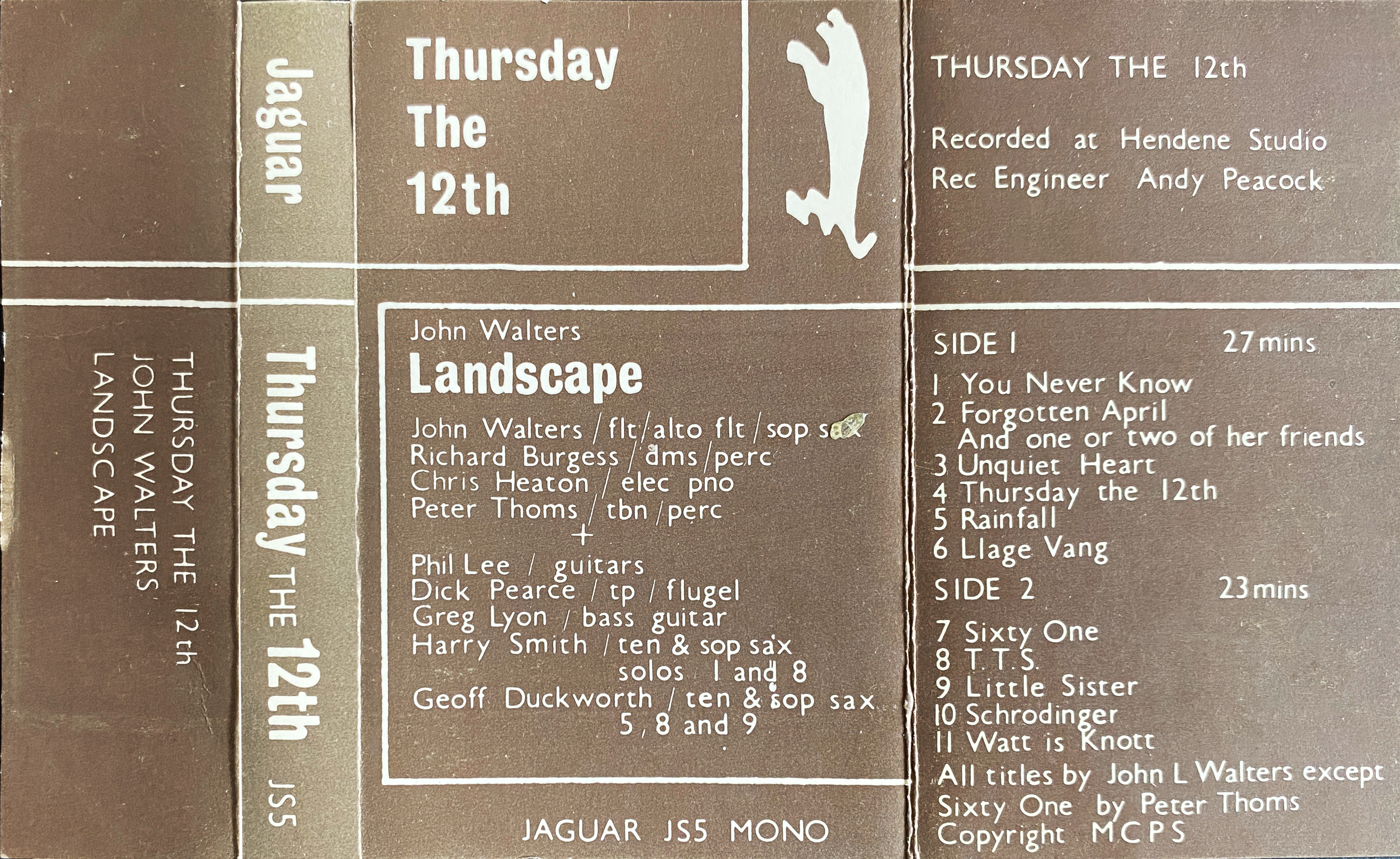 Landscape’s first album was Thursday the 12th (1975), a mono, cassette-only release on the Jaguar label founded by British jazz pianist Gordon Beck, a fantastic musician we all admired. Other artists on Jaguar included Don Weller’s band Major Surgery, and Beck’s own band.